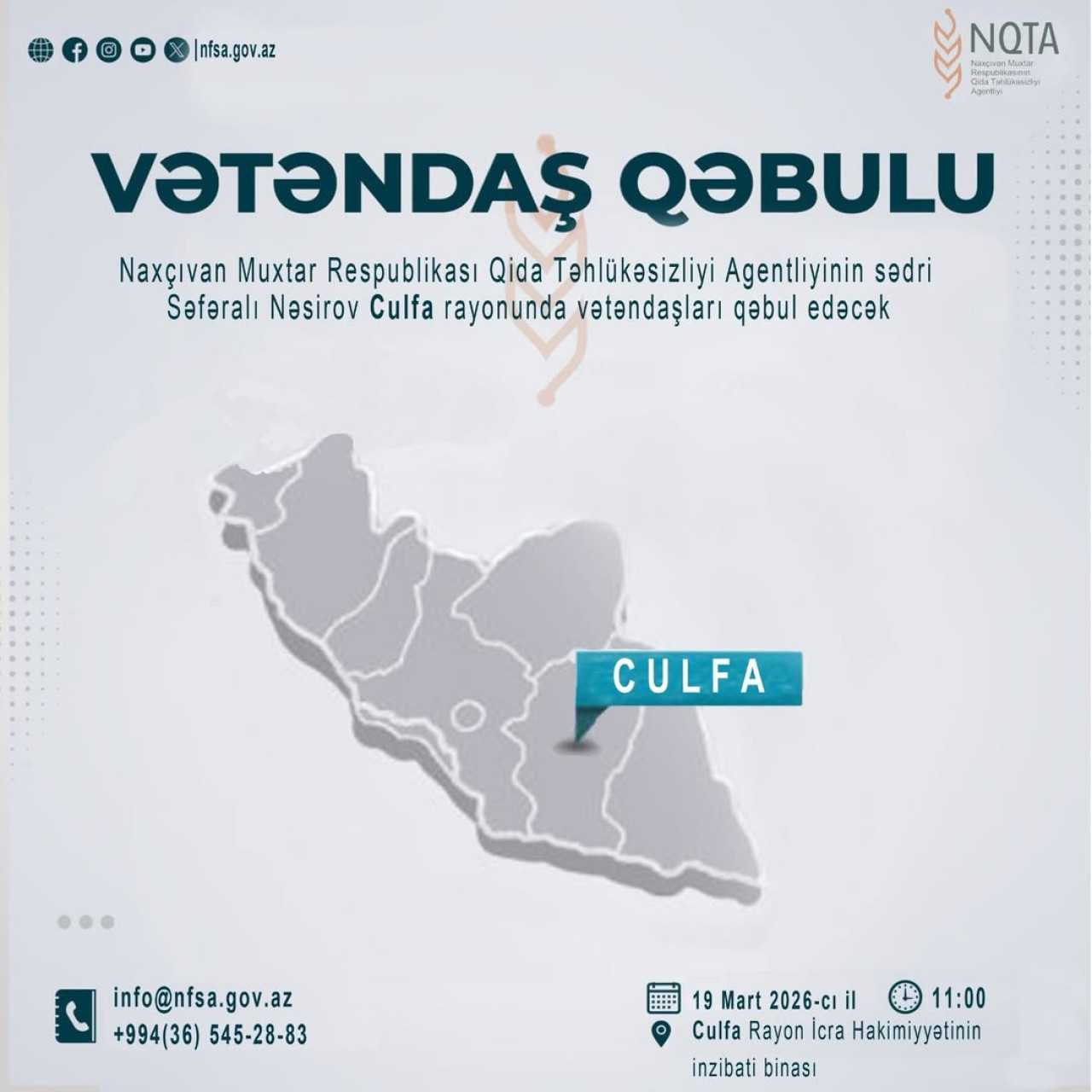 Mərkəzi icra hakimiyyəti orqanları rəhbərlərinin 2026-cı ilin mart ayı üzrə regionlarda vətəndaş qəbulu qrafikinə uyğun olaraq, Naxçıvan Muxtar Respublikasının Qida Təhlükəsizliyi Agentliyinin (NQTA) sədri Səfəralı Nəsirov mart ayının 19-u saat 11:00-da Culfa Rayon İcra Hakimiyyətinin inzibati binasında vətəndaşları qəbul edəcək.